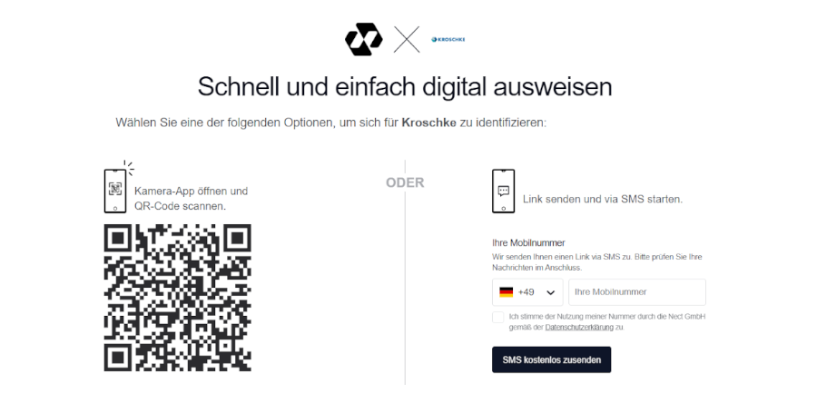 - Klicken Sie in der E-Mail, die Sie von Nect erhalten, auf den Button "Jetzt starten". Dieser leitet Sie auf die Verifizierungsseite weiter. Dort können Sie einen QR-Code scannen um die Verifikationsmethode auf dem Smartphone zu starten, oder sich einen Link per SMS zukommen lassen.